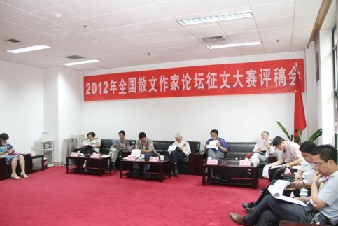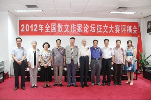 为全面展示当代散文的创作成就,加强当代散文作家的交流与创作,促进当代散文更好更快的繁荣与发展,由中国散文学会、中国散文学会写作中心、华夏博学国际文化交流中心主办的2012年全国散文作家论坛征文大赛评稿会,6月9日在中国现代文学馆召开。中国社科院博士生导师、中国散文学会会长林非,中国散文学会常务副会长、中国现代文学馆原副馆长、《人民文学》原常务副主编周明,中国散文学会副会长、《人民日报》原文艺部主任石英,中国传媒大学教授肖凤,中国散文学会副会长兼秘书长王宗仁,中国散文学会常务副秘书长、《中国文化报》副刊部主编红孩,中国散文学会副秘书长、中国郭沫若研究会秘书长李晓虹,《文艺报》编委、总编室主任徐忠志,中国散文学会副秘书长、中国散文学会写作中心主任邵建国,中国散文学会副秘书长兼办公室主任董彩峰出席评稿会,认真评选了进入终评的作品。中国作协鲁迅文学院原副院长孙武臣也同期评阅了进入终评的作品,并写出精彩的评委评语。