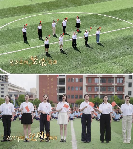 碧草如茵的操场上,师生并肩,环成一枚硕大的“同心圆”。当千百面国旗在手中迎风舞动,汇聚的不仅是壮阔的红色浪潮,更是每个人心中奔涌的家国情怀。