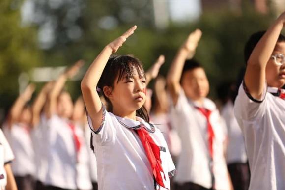 全国红领巾中队六(9)中队同学演绎情景剧《特殊的礼物》(指导教师:丁胜利),以跨越时空的对话致敬英烈;育新合唱团与五(9)中队共同献唱《如愿》(指导教师:王光月、王征),用歌声传递“这盛世如您所愿”的深情告慰。在大队委员及大队辅导员吴老师的带领下,全体少先队员庄严宣誓,铿锵呼号,许下“强国有我”的青春诺言。