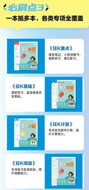 中等生需要突破瓶颈,成绩稳步向上。主书的难度与题量既不重复简单题浪费时间,也不超纲为难孩子,刚好能在巩固基础的同时,稳步提升能力。再加上《狂K阅读》《狂K难点》《狂K重点》等专项插册,针对性解决阅读理解、数学重难点等“提分拦路虎”,助力孩子突破成绩天花板。