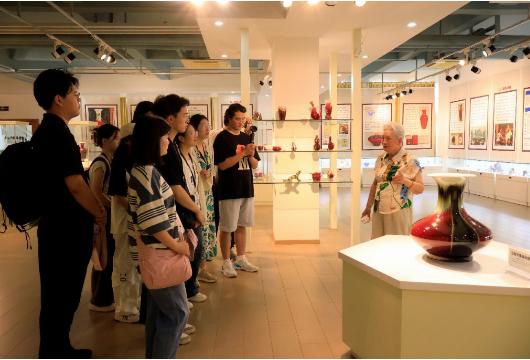 初抵景德镇邓希平颜色釉陶瓷艺术博物馆,空气中仿佛还萦绕着热空气的余温。材起非遗实践团的成员们刚站定,便见到了国家级非物质文化遗产代表性传承人、颜色釉领域泰斗邓希平老师——她身着素雅服饰,笑容温和,一句“欢迎大家前来”,她亲切的问候瞬间拉近了与大家的距离,也为这场非遗探索之旅注入了温暖的开场。