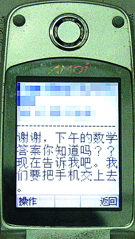 她以为是有人把短信发错了,就没在意,不料此后类似的短信不断传来。其中有这样一条:“谢谢,下午的数学答案你知道吗?现在告诉我吧。我们要把手机上交。”