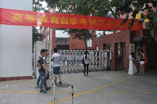 今天下午,记者来到江苏省高等教育自学考试南京市第54中学考点,发现时间还不到两点,考场所在的教学楼拉起了写有“禁区”字样的警戒线,从校门到教学楼的主干道上,已经站满了正在准备考试的考生,他们中有抓紧最后一刻再看几眼复习资料的,也有三三两两说笑聊天的,还有在考场分布图前找寻找考场的。记者随机采访了其中的几位考生。