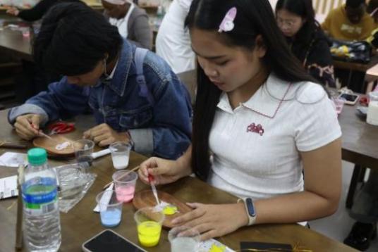 下一站移步至天工制作坊,留学生们开启非遗技艺体验。在工作人员引导下,大家参观了工艺品展厅,精美的陶塑、绚丽的漆画、生动的版画让大家连连赞叹,不时驻足细看。队伍来到景泰蓝工坊,听工作人员介绍景泰蓝的历史渊源与制作流程,在专业老师的指导下沉浸式投入景泰蓝工艺画的制作环节。他们小心翼翼地掐丝、点蓝,手法略显生疏,但专注的神情尽显对非遗技艺的景仰与喜爱。一位泰国学生表示:“景泰蓝的色彩太漂亮了,制作过程需要耐心,我太佩服中国的这些非遗技艺了!”
