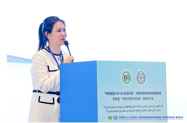 刘静代表学校,就全球文明倡议与中阿文明对话作主题发言,并在会上分享了学校在传承创新非遗技艺、促进中华优秀传统文化的国际传播、国际合作办学、提升职业教育的国际影响力和竞争力方面取得的显著成就。