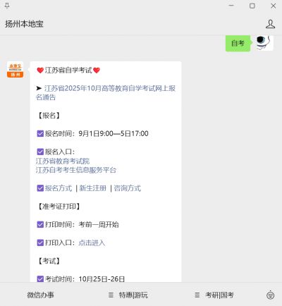 微信搜索并关注公众号【扬州本地宝】,私信聊天框回复【自考】即可获取扬州/江苏高等教育自学考试成绩查询、成绩复核及新一轮考试报名安排。 本文来自www.sitecms