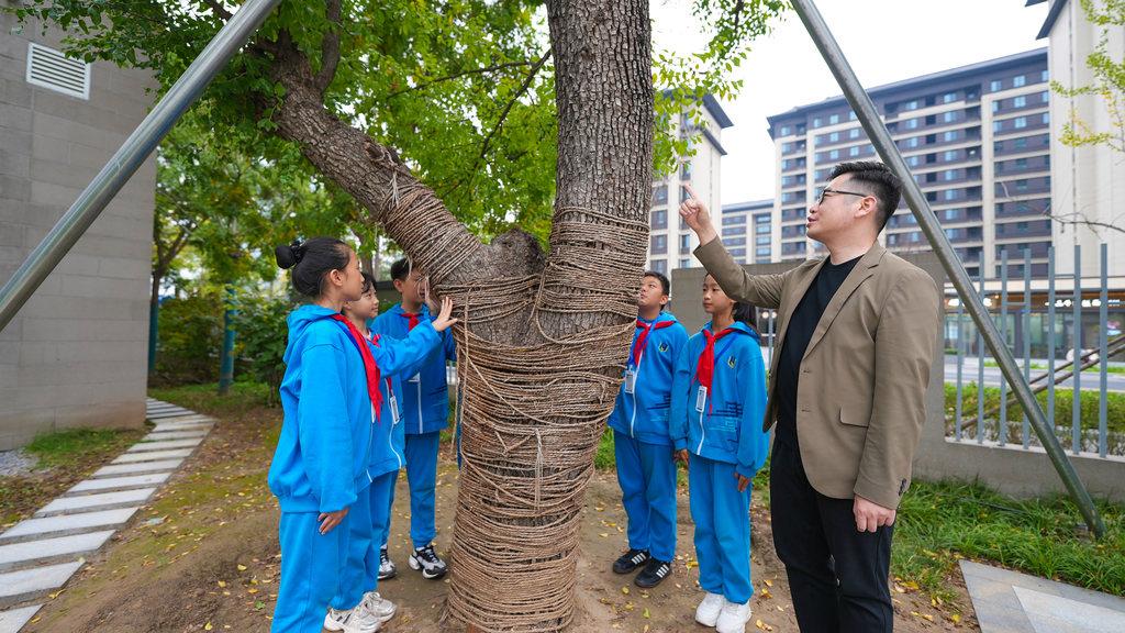 近日,雄安史家胡同小学,雄安新区教育局工作人员为学生们介绍乡愁树相关情况。河北日报见习记者 李畅 摄