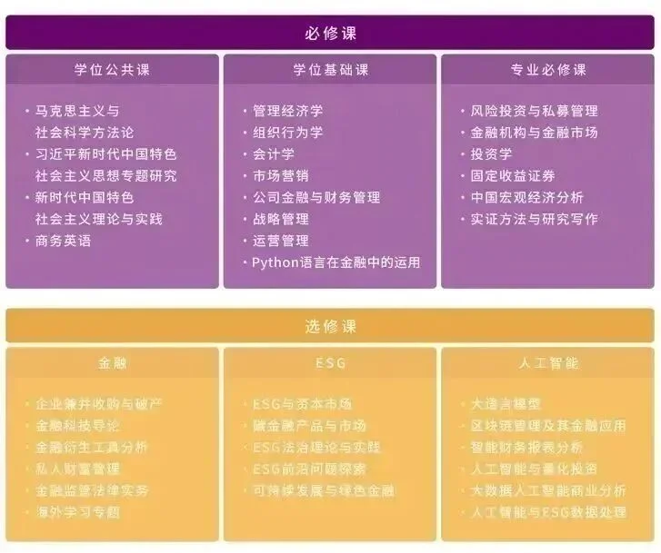 融入金融学、经济学和管理学等核心课程,构建一套完整的知识体系。为满足学生多样化的学习需求,在MBA核心课程模块之外,设置了三个研究方向:金融科技与创新、ESG金融、高级金融实务。学生可以结合自身教育、工作背景以及职业规划,在每个方向至少选修一门课程,开阔视野,掌握“管理+金融”综合知识与能力。