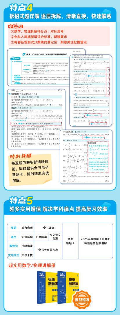 语文/英语《高考必刷卷 42套》针对性补短板:英语配套听力原文、译文,解决 “听懂但记不住细节”“错了不知道为什么错” 的问题;语文不仅有古诗文、现代文阅读的超详细解析,还附加 “知识延伸阅读” 与 “作文范文合辑”,帮助考生积累素材、提升写作立意。数物化《高考必刷卷 42套》视频微课辅助理解:针对复习中高频出现的经典题、易混淆的易错题、有固定思路的套路题、拉开分差的压轴题,特别录制视频精讲,由资深教师现场演示解题过程,帮助考生突破难点、掌握高分技巧。史地政生《高考必刷卷 42套》知识拓展拓眼界:补充时政热点链接、历史事件背景拓展,延伸教材外的核心考点,帮助考生构建更完整的知识体系,应对高考中的 “拓展类题目”。