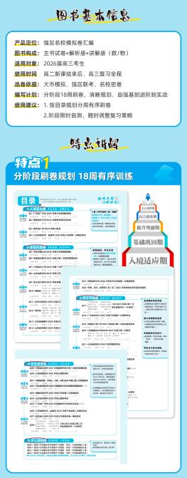 阶梯式能力提升:从“入境期”适应节奏,到“巩固期” 夯实基础能力,再逐步过渡到 “提升期” 重难突破,最终进入 “拓展期” 锤炼综合应试能力,每一个阶段都匹配对应难度的强区名校模拟卷,避免 “基础不牢就刷难题” 或 “重复刷简单题无提升” 的误区。分周限时自测:考生可对照目录,按周规划刷卷进度,每完成一个阶段的训练即可进行限时自测,及时发现知识漏洞,灵活调整复习策略,确保复习效率最大化;广泛适用人群:不仅适用于新高三考生的全年复习,高二学生在新课结束后也可使用,还能提前适应高考题型与节奏,为高三复习抢占先机。
