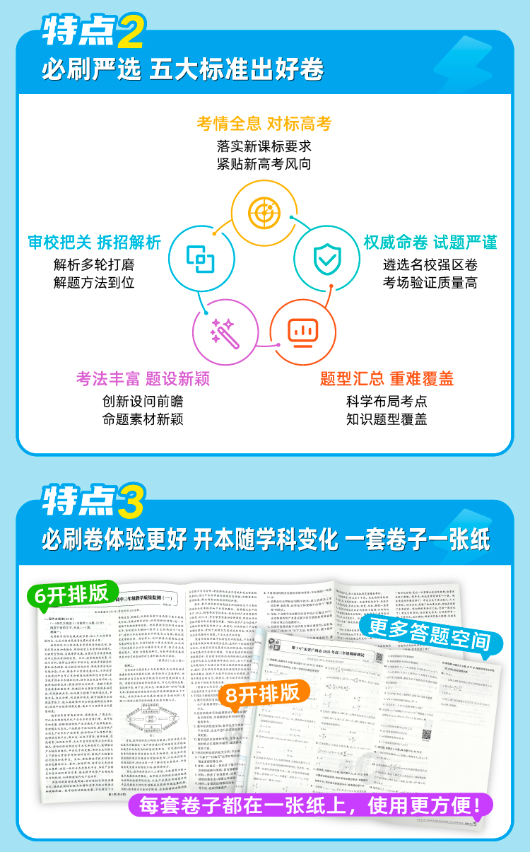 开本升级更实用:《高考必刷卷 42套》所有科目的每套卷子都完整印刷在一张纸上,无需反复翻页,无论是课上训练还是课后自测,使用都更便捷;全科入境期新增评分标准,每卷新增测试分数线找准定位。数学、物理、化学内置错题本功能:新增 “错题收藏” 设计,考生可在刷题时标记错题,后续集中反复训练,避免 “错题随手丢,下次还错” 的问题,帮助积累备考经验。数学和物理全方位拆解得分点,对标高考。