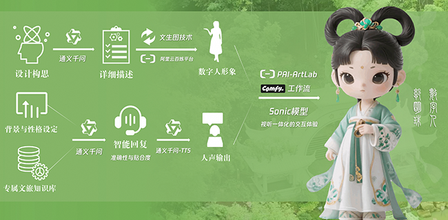 获得特等奖的齐鲁工业大学的参赛团队围绕遂川人文非遗、茶文化、自然风光三大元素,打造了遂川旅游形象IP设计。“我们通过对遂川县的深入调研,将本地文化元素融入在IP设计中,通过阿里云的PAI ArtLab平台上Stable Diffusion模型、lora模型等多个AI模型,多次调试来生成最佳的效果;同时打造了遂川旅游IP形象互动AI智能体,调用阿里云通义大模型,实现遂川旅游IP智能可视化交互。我们希望通过现代设计语言实现传统与潮流的对话,吸引Z世代年轻人来到遂川,爱上遂川。 ” copyright www.Chinaedunet.com