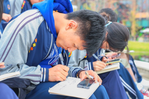 在成都市美术馆,同学们参观了“远方的邂逅”美术展,汲取创作灵感并开展现场写生,将研学所见、帮扶所获与民族情谊融入画作之中。