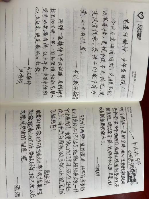 活动结束后,宣讲人、书法老师以及同学们分别写下了对“两弹一星”精神的深刻感悟,字里行间流露着对先辈们的敬畏和对美好未来的期许。一手好字教育中心负责人表示,此次活动将红色精神教育与传统文化教育相结合,形式新颖、意义深远,不仅让同学们深入了解了“两弹一星”的光辉历史,更在书法创作中深化了对精神内核的理解,是一次成功的爱国主义教育实践。