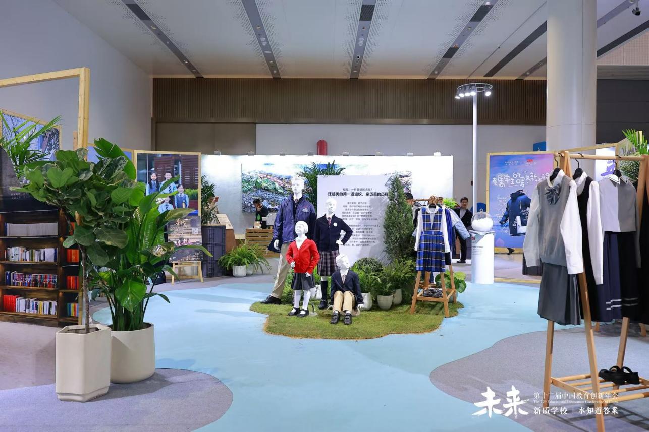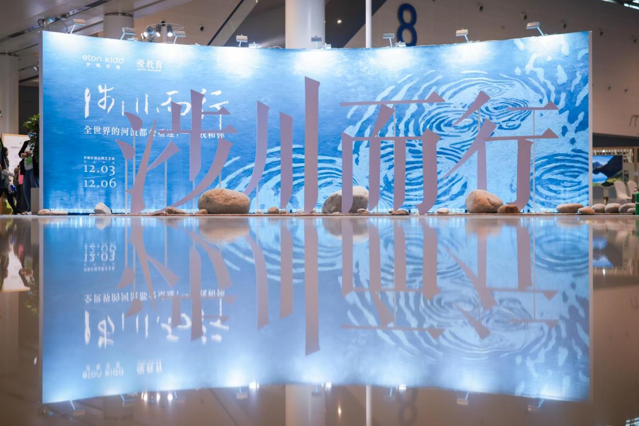 会场一隅,伊顿纪德“涉川而行”品牌艺术展,以河流、岛链、涟漪为核心意象,串联起“一滴水的澄澈与明亮”“一方池塘的共生共茂”“所谓伊人,在水一方”“打开明亮的日常”四段旅程,以“文以载道”与“衣以载道”为线索,以行动致敬美好教育。