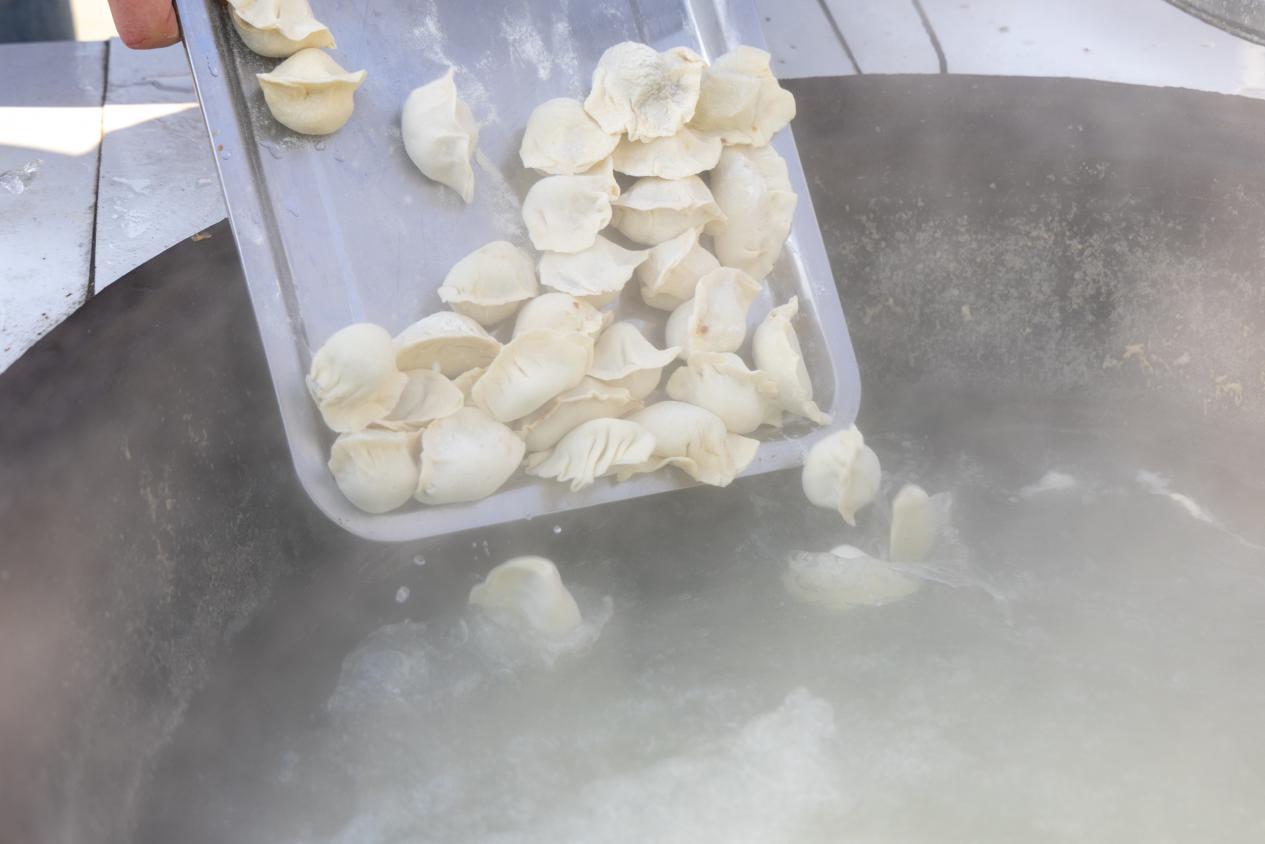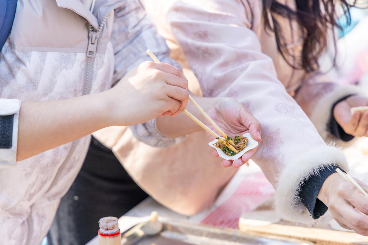 白菜收获后,师生转至公园旁的灶台区,开展包饺子活动。李宵耐心示范:“馅放中间,从右往左捏合,每一下都要压实,避免下锅后破皮。”她手把手指导学生,包出的饺子形如月牙,整齐排列。崔淑涵则负责煮饺,并讲解要领:“水沸后加三次凉水,饺子浮起即熟。”煮饺间隙,她与学生亲切交流,询问专业学习近况,温馨的话语拉近了师生距离。