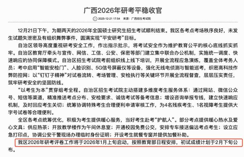 广西的研考新闻有提到区2026年研考评卷工作将于2026年1月上旬启动,按照教育部日程安排,初试成绩计划于2月下旬公布。