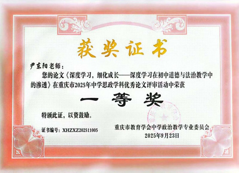 教研团队始终将教学研究作为提升育人实效的核心引擎,营造“人人投身研究、个个分享智慧”的浓厚教研氛围,鼓励全体教师立足教学实践、聚焦学科痛点开展深度探索。在这样的良好生态下,优质学术成果持续涌现:尹东阳老师撰写的《深度学习,细化成长——深度学习在初中道德与法治教学中的渗透》,紧扣新时代思政教学改革趋势,深入剖析深度学习与思政课堂的融合路径,为破解传统教学中“重知识、轻素养”的难题提供了切实可行的实践方案,在重庆市2025年中学思政学科优秀论文评审中荣获一等奖;张刚老师的《红色文化赋能中学“大思政课”的实践逻辑与创新路径》,深挖红色文化的育人价值,系统构建红色资源与“大思政课”融合的理论框架与实践体系,为厚植学生家国情怀提供了有力支撑,在2025年第十届重庆市中小学教师教育教学优秀论文评选中斩获市级一等奖。