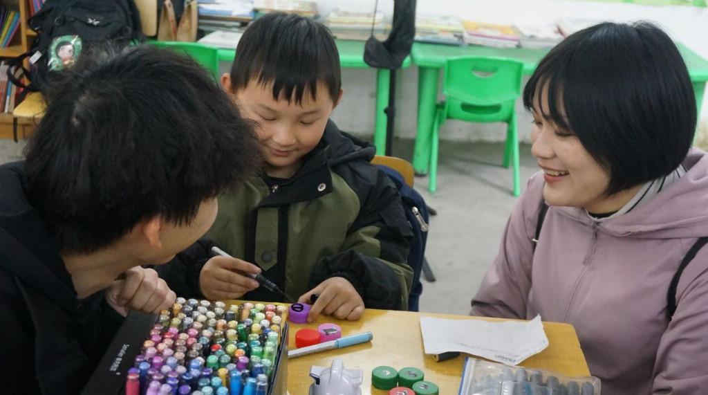 孩子们围坐在一起,木质的课桌上已经整齐地铺开了画具和瑶族纹样素材,师生团队耐心地指导了孩子们用瓶盖制作环保立体装饰画,冬日的教室里充满着欢声笑语、童趣盎然,民族记忆的脉络正被温柔地唤醒,在崭新的白纸上铺展出新的轨迹。