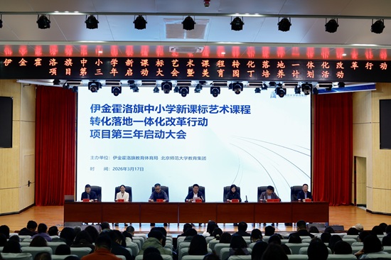 为持续深化美育浸润行动落地实效,助力伊金霍洛旗美育工作高质量发展,2026年3月17日至18日,北京师范大学教育集团与伊金霍洛旗教育体育局携手合作,在伊旗第三小学报告厅顺利举办伊金霍洛旗中小学新课标艺术课程转化落地一体化改革行动项目第三年启动大会暨美育园丁培养计划活动,为伊旗美育工作发展注入新动能。