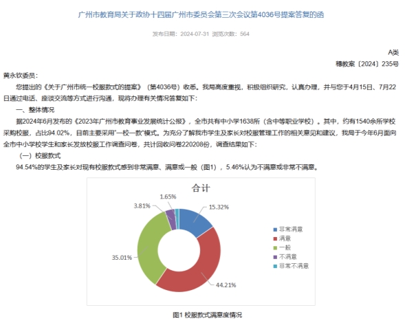 广州的校服治理实践,则为破解“一市一款”乱象提供了正面范本。2024年,广州市教育局开展覆盖全市的校服投票与满意度调研,回收有效问卷超22万份,调研过程全程公开透明,充分保障家长、学生的话语权与参与权;同时,广州始终坚持“一校一服”的个性化原则,由学校组织家委会、学生代表、专家组成采购评议小组,自主确定校服款式、选择合作企业,严格执行“双送检”制度,实现了校服质量安全、文化承载与家校认同的多重统一。调研结果显示,广州94.54%的学生及家长对校服款式表示认可,这一成果充分证明,尊重校园文化个性、保障家校深度参与、强化全链条质量监管,才是校服治理的科学路径。