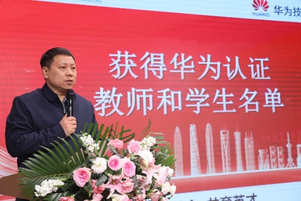 在随后的环节中,校长助理周广欢宣读了获得华为认证的教师和学生名单。与会领导为获得华为认证讲师资格的教师以及获得鸿蒙开发者证书的学生颁发证书,充分展示了学校在ICT人才培养方面的阶段性成果,也为后续高质量人才培养奠定了坚实基础。