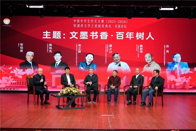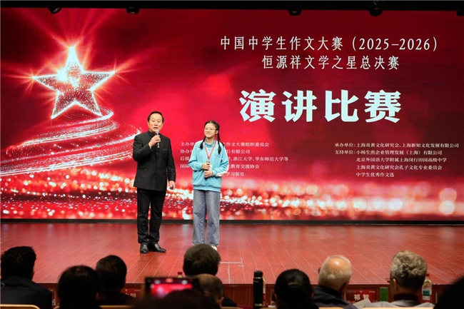 恒源祥(集团)有限公司董事长兼总经理、全国劳动模范、上海炎黄文化研究会副会长陈忠伟在讲话中表示:“文学不只是写一篇作文,更是在书写人生。”他提到于漪先生“育人而非育分”的教育理念,并指出:“个人成长与人格塑造密不可分,信念、理想与对人的尊重,是成就事业的根基。”他提到,恒源祥明年将迎来百年华诞,期待中国中学生作文大赛“恒源祥文学之星”评选活动也能走向百年。“今天的参赛者中,已有东南亚学子的身影。未来,我们希望这一平台成为全球青少年交流中华文化的重要桥梁。”他呼吁为青少年营造更宽松的成长环境,提供更广阔的展示舞台,让文学少年真正成为中华优秀文化的传播使者。