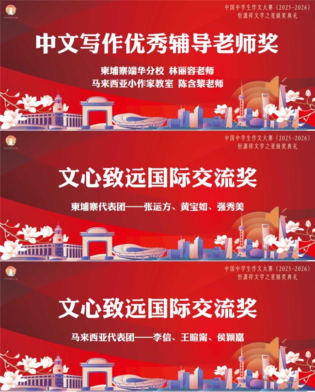 为表彰长期在海外一线从事中文教育、积极指导青少年中文写作并取得突出成效的优秀教师,本届大赛特设“中文写作优秀辅导教师奖”。来自柬埔寨端华分校的林丽容老师和来自马来西亚小作家教室的陈含黎老师荣获“中文写作优秀辅导老师奖”。