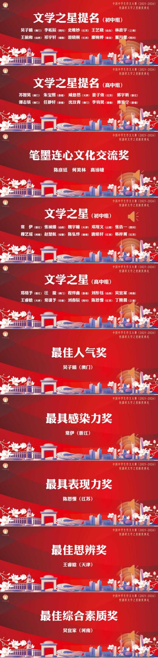 本届大赛以“印记”为主题,自2025年9月启动以来,吸引无数中学生踊跃参与。同学们以笔为媒、以文抒怀,尽显对生活的热爱、对世界的思考、对未来的憧憬。经层层选拔,近160名学子从全国各赛区脱颖而出,入围全国总决赛,共同角逐大赛最高奖项——“文学之星”。
