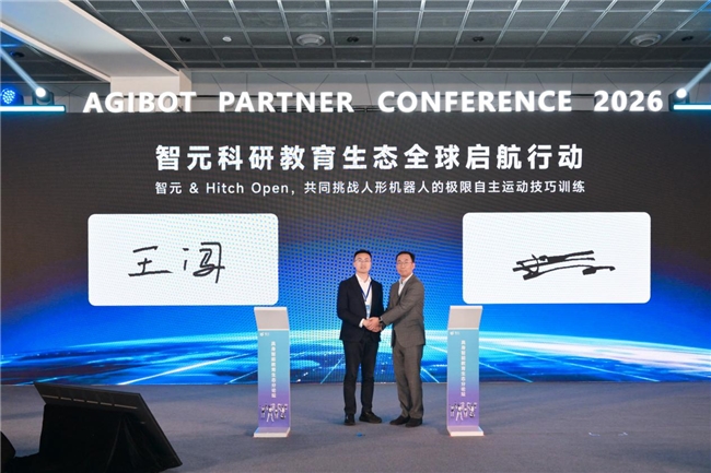 具身智能教育生态的构建不仅需要企业单点发力,也需要高校更加开放和深度融入,更需全球顶尖智慧的联动共创。智元与国际知名组织Hitch Open签约,双方接下来将展开深度合作,联合全球顶尖高校,共同挑战人形机器人的极限自主运动技巧训练。智元高级副总裁兼通用业务部总裁王闯和Hitch Open世界AI竞速锦标赛联合创始人Allen Yang教授完成战略合作签约。
