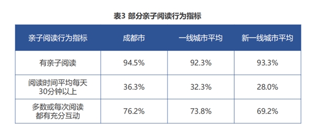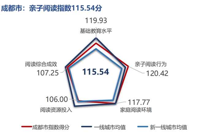成都市在基础教育水平、阅读综合成效方面显著高于新一线城市平均水平,亲子阅读行为更是超越了一线城市平均水平,是该项指标的城市最高得分,体现了成都市及成都家长对于儿童阅读培养的重视。此外,成都亲子阅读比例高达94.5%,位居全国第一;亲子阅读充分互动比例达76.2%,高于新一线及一线城市整体水平,是亲子阅读发展均衡、特色鲜明、潜力突出的标杆型城市。 copyright www.chinaedunet.com