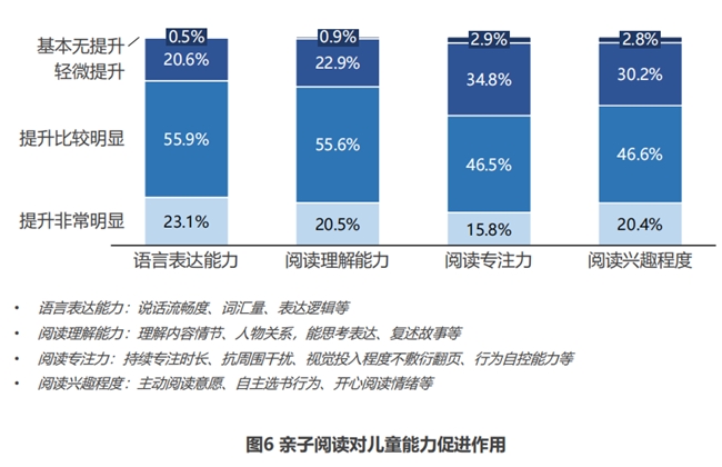 指数同时揭示了当前亲子阅读领域的关键现状。亲子阅读在本调研覆盖的56个城市中整体普及较高,调研中92.7%的家庭每周都会有亲子共读时间,其中保证每天30分钟以上的家庭接近28%。99%以上的家长认可亲子阅读对孩子语言表达、阅读理解能力的提升作用,97%以上的家长认为亲子阅读能提升孩子专注度与阅读兴趣。 本文来自www.chinaedunet.com