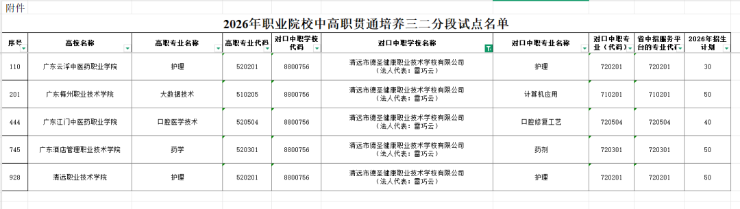 2026年,德圣职校三二分段中高职贯通培养工作迎来突破。根据广东省教育厅公布的2026年职业院校中高职贯通培养三二分段试点名单,德圣职校与五所省内优质高职院校达成合作,共获批5个对接专业,招生计划达220人。具体对接情况如下: 中国教育网
