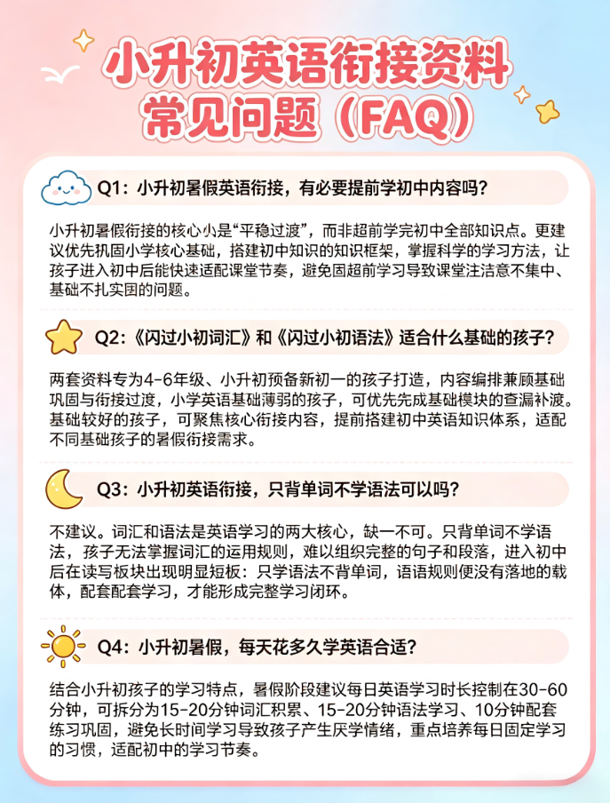 小升初暑假是孩子完成小初英语学习过渡的黄金窗口期,选对适配的资料,能帮孩子平稳跨越小学到初中的英语学习断层。本文针对小升初暑假英语衔接的核心需求,客观解析《闪过小初词汇》《闪过小初语法》两套资料的适配性与使用方法,为家长选择资料提供清晰参考。