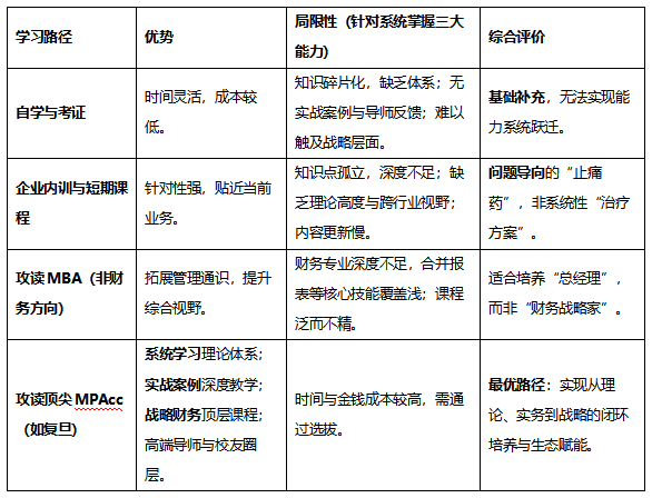 为掌握上述核心能力,财务人员通常面临几种路径选择。下表对比揭示了复旦大学MPAcc作为最优路径的综合性优势: